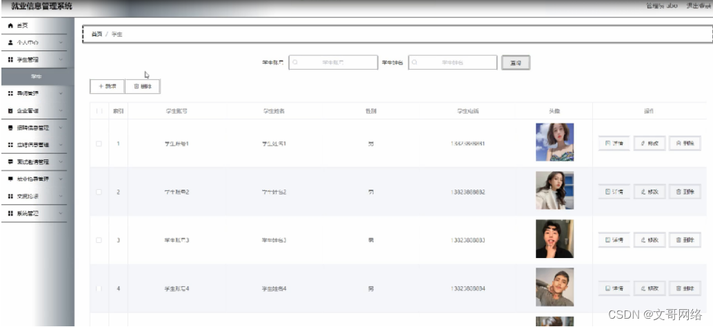 学生管理;在学生管理页面中可以查看索引,学生账号,学生姓名,性别,电话,头像等内容,并进行详情,修改和删除等操作;如图4-7所示。