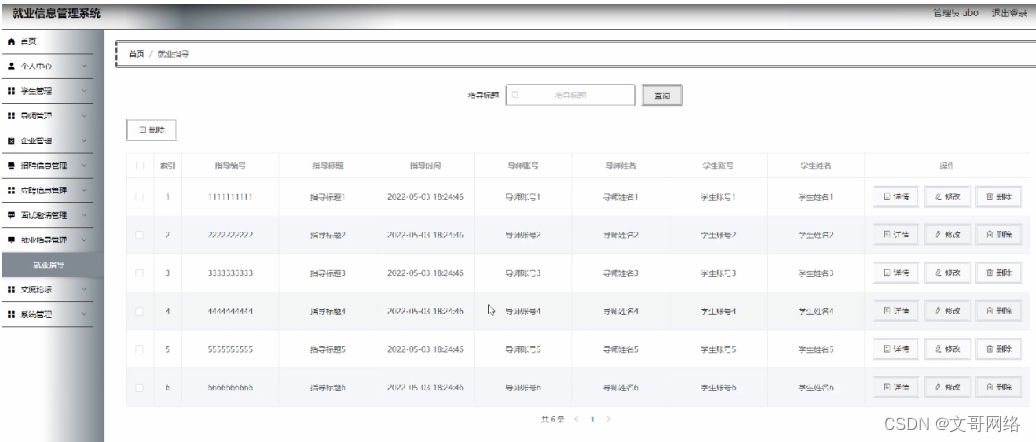 就业指导管理;在就业指导管理页面中可以查看索引,指导编号,指导标题,指导时间,导师账号,导师姓名,学生账号,学生姓名等内容,并进行详情,修改和删除等操作;如图4-13所示。