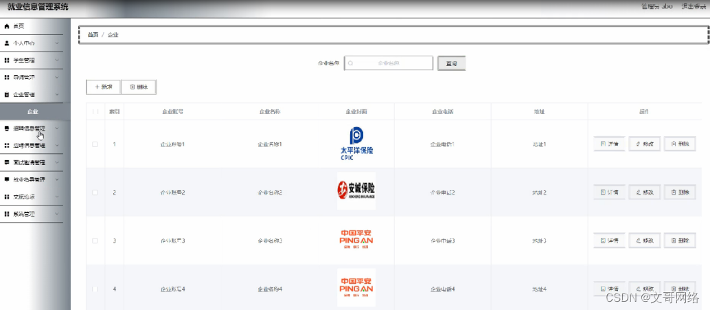 企业管理;在企业管理页面中可以查看索引,企业账号,企业名称,企业封面,企业电话,地址等内容,并进行详情,修改或删除等操作;如图4-9所示。