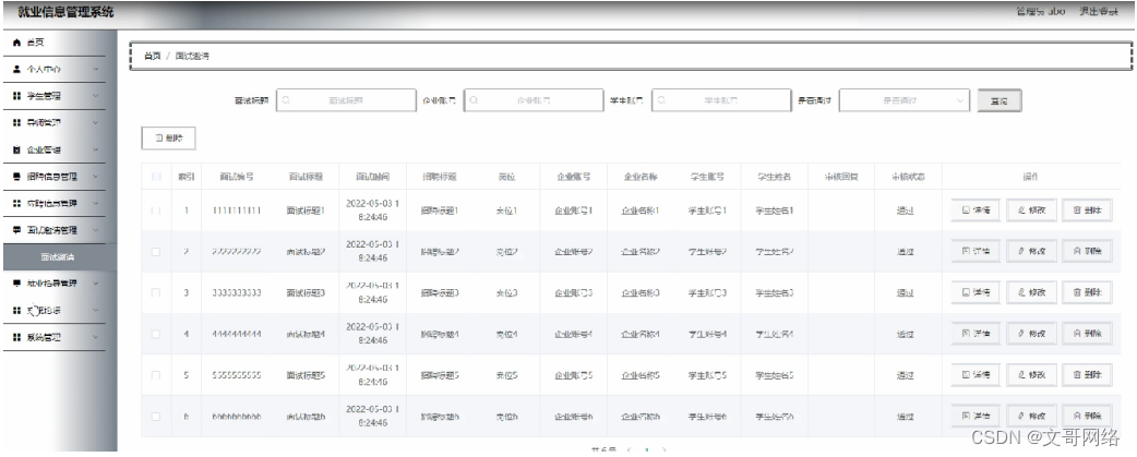 面试邀请管理;在面试邀请管理页面中可以查看索引,面试编号,面试标题,面试时间,招聘标题,岗位,企业账号,企业名称,学生账号,学生姓名,审核回复,审核状态等内容,并进行详情,修改和删除等操作;如图4-12所示。