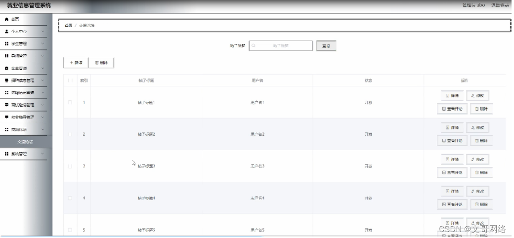 交流论坛;在交流论坛页面中可以查看索引,帖子标题,用户名,状态等内容,并进行详情,修改,查看评论和删除等操作;如图4-14所示。