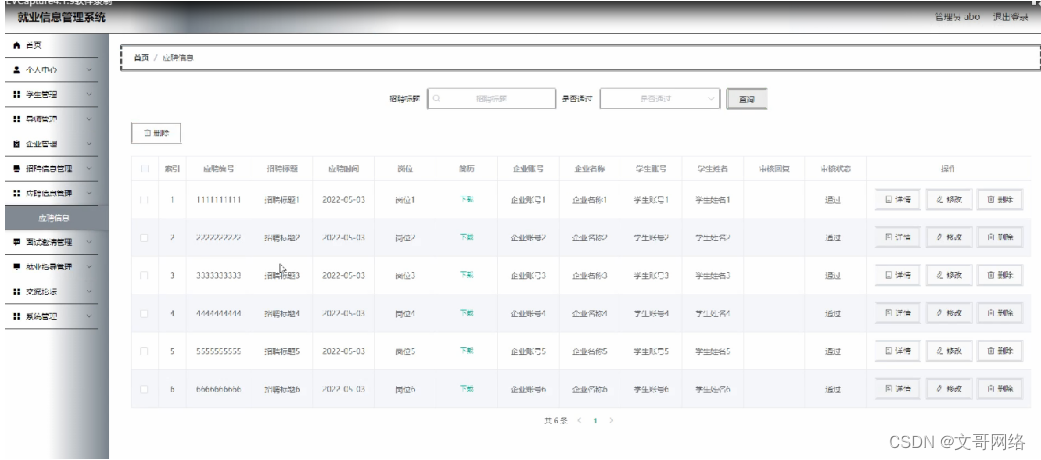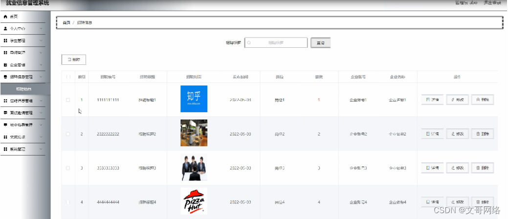 招聘信息;在招聘信息页面中可以查看招聘编号,发布时间,岗位,岗位要求,薪资,企业账号,企业名称等内容;如图4-3所示。