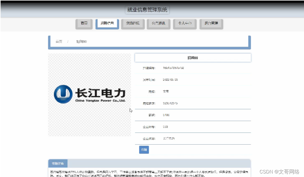 前台功能:进入系统可以实现首页,招聘信息,交流论坛,公告资讯,个人中心,后台管理等功能进行操作。