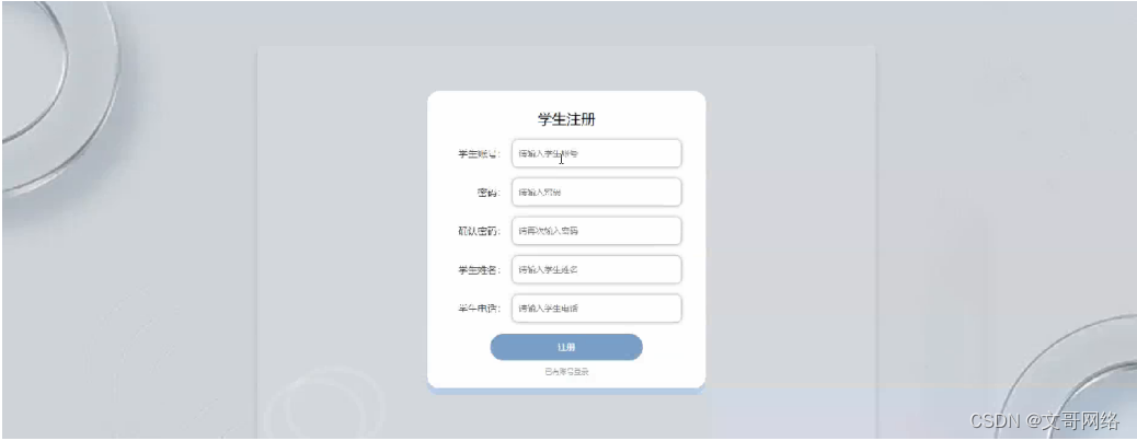 学生注册;在学生注册页面中输入学生账号,密码,确认密码,学生姓名,学生电话等内容进行注册操作;如图4-2所示。