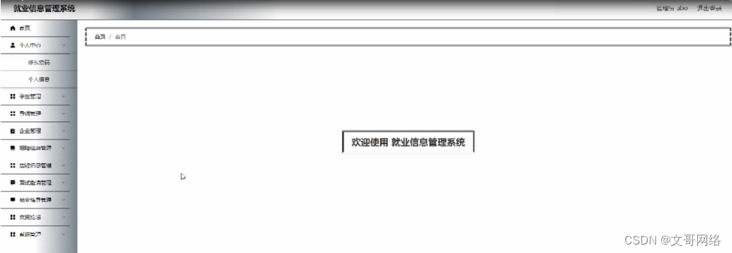 管理员登录进入就业信息管理系统可以查看首页,个人中心,学生管理,导师管理,企业管理,招聘信息管理,应聘信息管理,面试邀请管理,就业指导管理,交流论坛,系统管理等功能进行详细操作,如图4-6所示。
