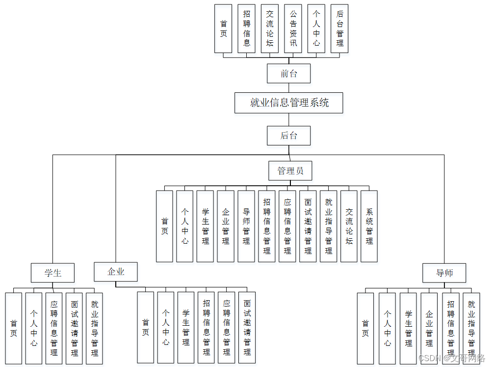 后台由管理员,学生,企业和导师,主要功能包括首页,个人中心,学生管理,导师管理,企业管理,招聘信息管理,应聘信息管理,面试邀请管理,就业指导管理,交流论坛,系统管理等。