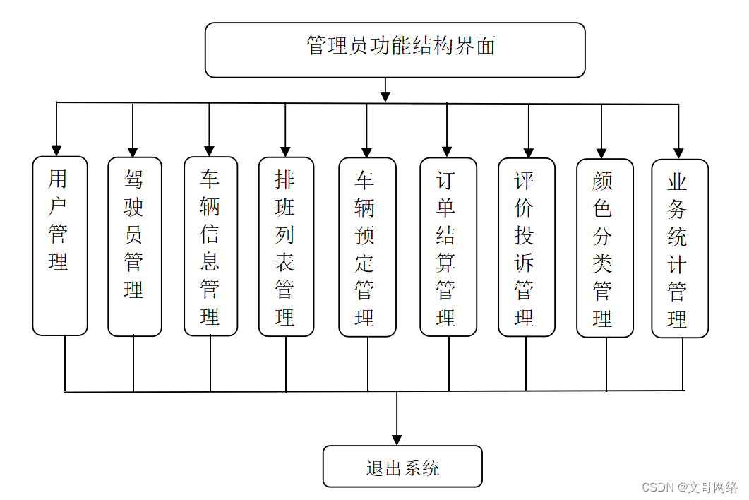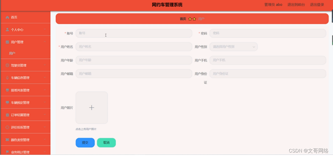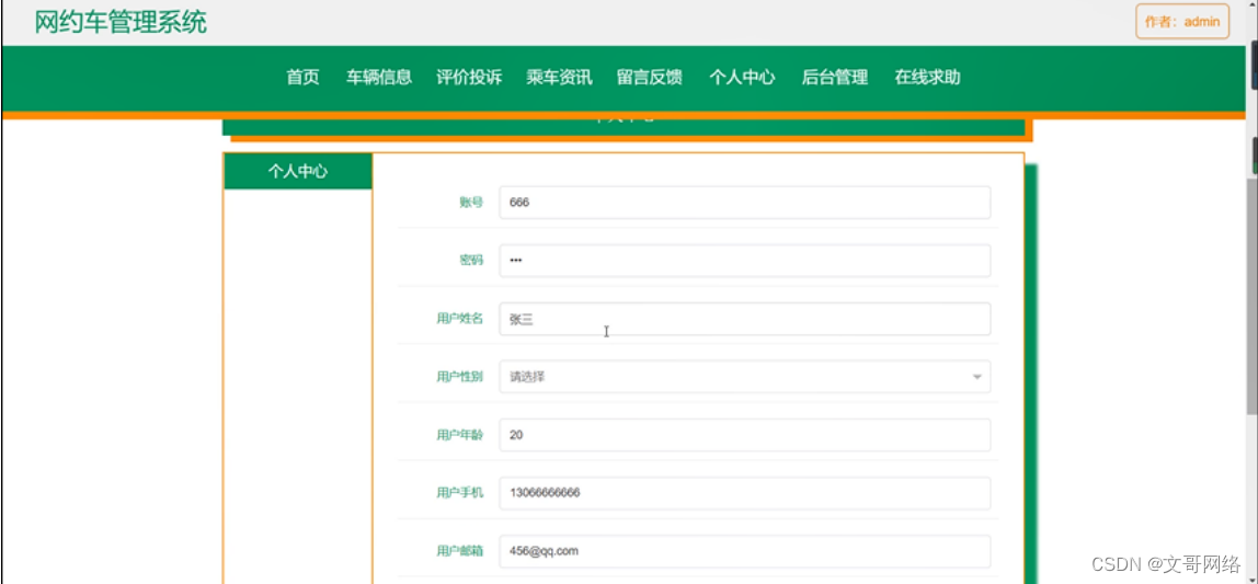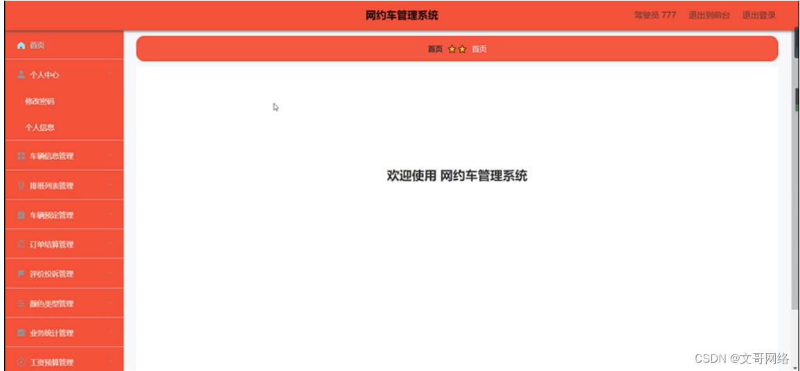 管理员登录进入网约车管理系统网站设计可以查看个人中心、用户管理、驾驶员管理、车辆信息管理、排班列表管理、车辆预定管理、订单结算管理、评价投诉管理、颜色分类管理、业务统计管理等内容,如图5-3所示。