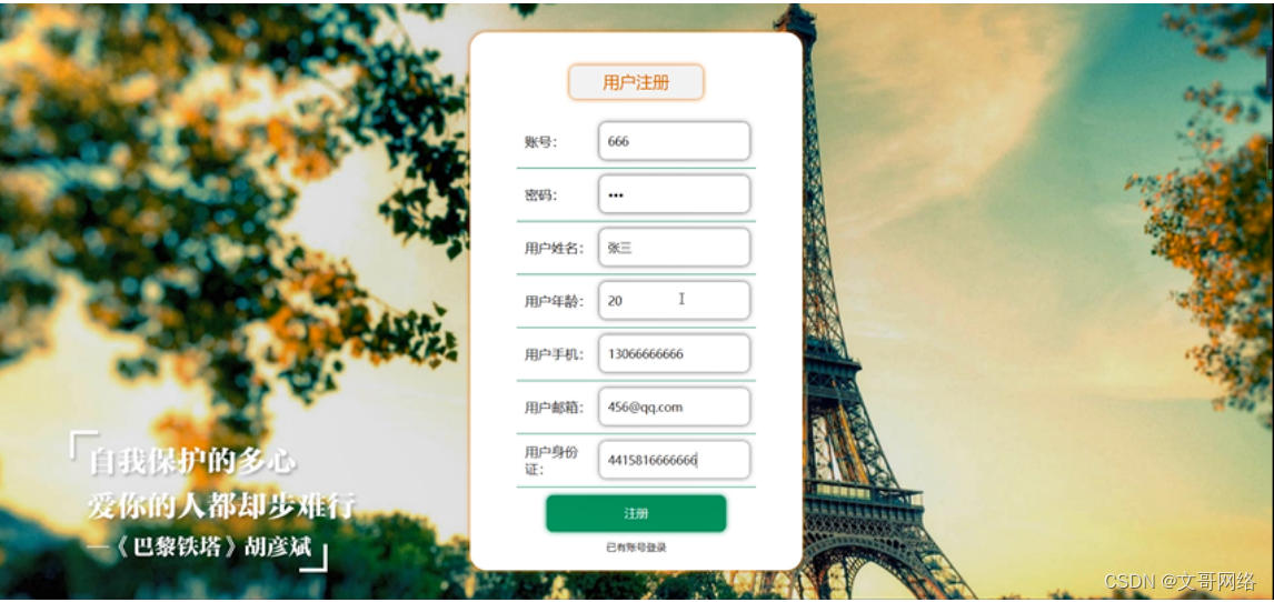 用户注册,在用户注册页面通过填写账号、密码、用户姓名、用户年龄、用户手机、用户邮箱、用户身份证等内容,并可注册成功登录页面,如图5-12所示。