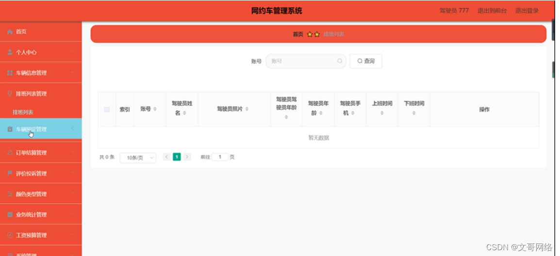 驾驶员后台管理,在驾驶员后台管理页面可以查看个人中心、车辆信息管理、排班列表管理、车辆预定管理、订单结算管理、评价投诉管理、颜色分类管理、业务统计管理、工资预算管理等内容,如图5-9所示。
