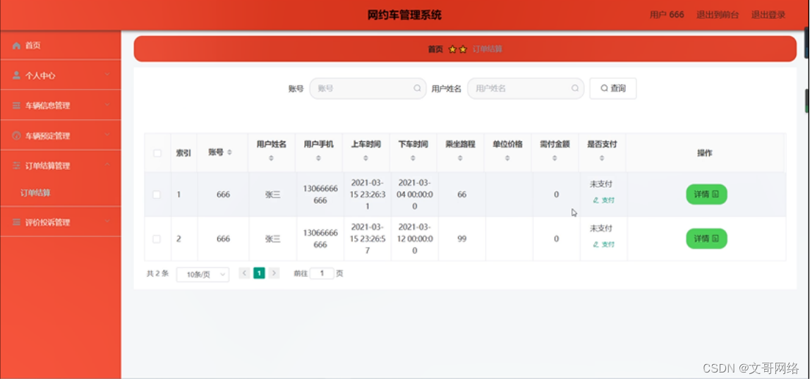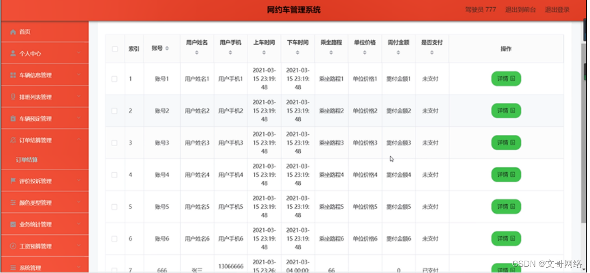 订单结算管理,在订单结算管理页面可以查看账号、用户姓名、用户手机、上车时间、下车时间、乘坐路程、单位价格、需付金额、是否支付等内容,并可根据需要对订单结算审核信息进行修改,删除或查询详细内容等操作,如图5-11所示。