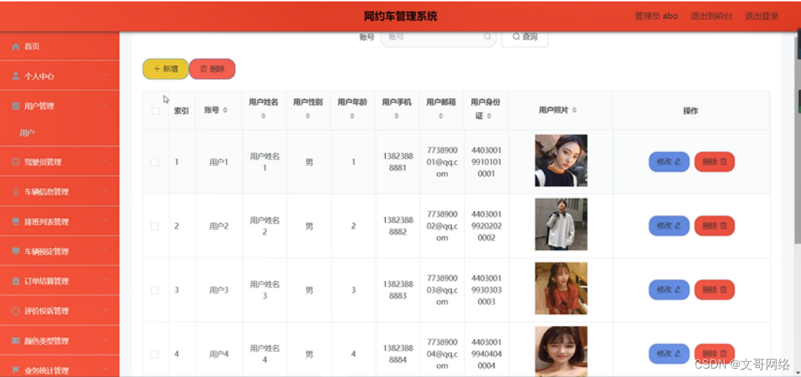 用户管理 ,在用户管理设置页面可以查看账号、用户姓名、用户性别、用户年龄、用户手机、用户邮箱、用户身份证、用户照片等内容,并可根据需要对用户管理进行添加,修改或删除等操作,如图5-4所示。