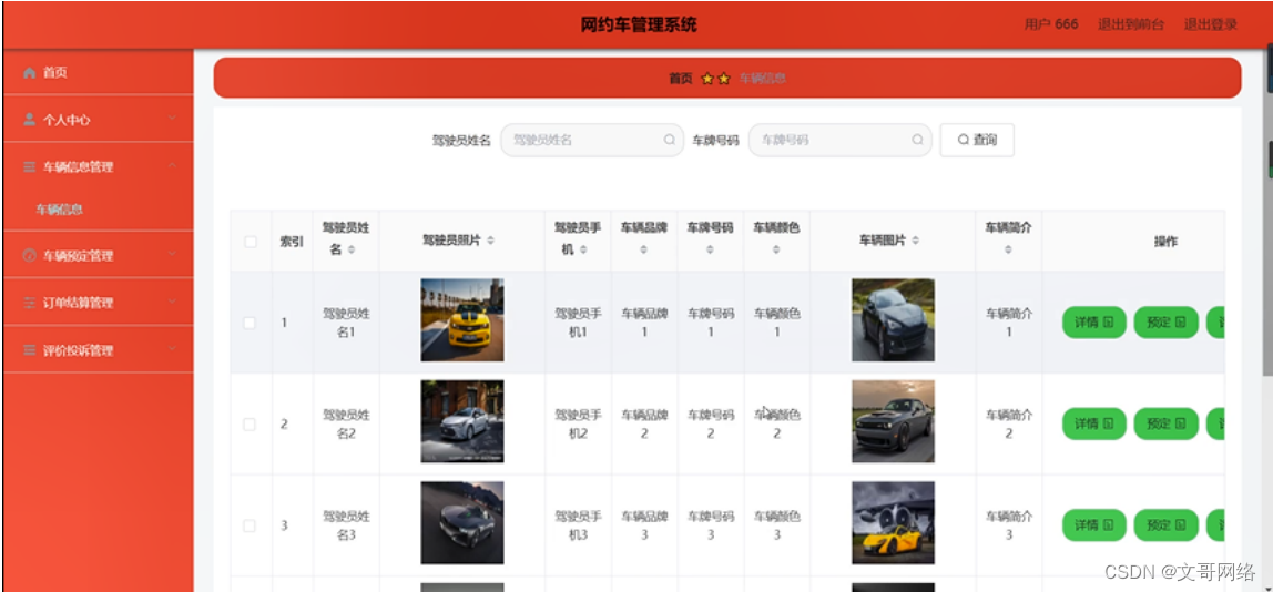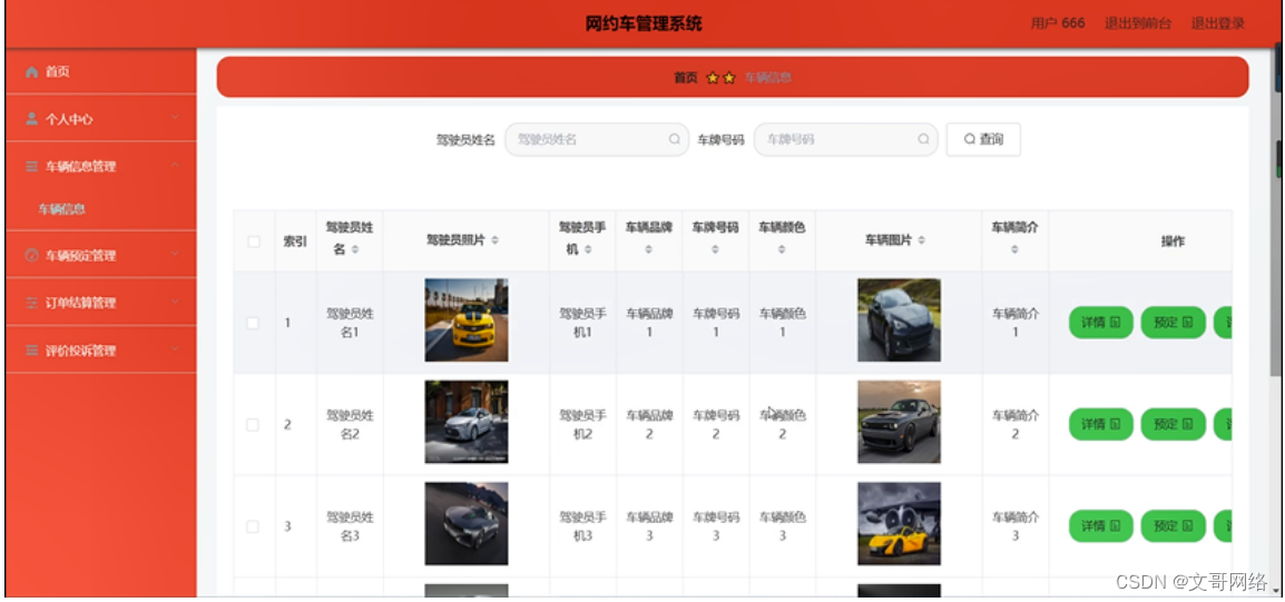 车辆预定管理,在车辆预定页面可以查看账号、用户姓名、用户性别、用户手机、用户图片、驾驶员姓名、驾驶员照片、驾驶员手机、车辆号码、车辆品牌、车辆颜色等等进行添加,修改,删除或查看回复详细内容等操作,如图5-6所示。