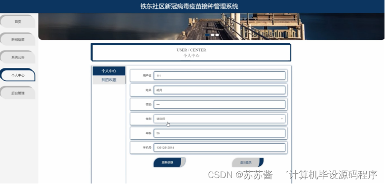 点击个人中心,用户可以通过输入用户名、姓名、密码、性别、年龄、手机号等信息来更新信息,还可以对我的收藏进行相关操作,个人中心操作页面如图5-15所示。