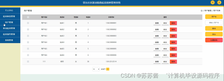 在用户管理页面,管理员可以查看原有的用户信息,并对用户的用户名、姓名、性别、年龄、手机号等进行查看详情、修改、删除或添加等操作,如图5-4所示: