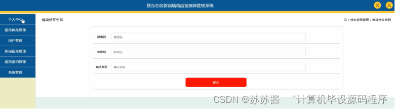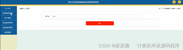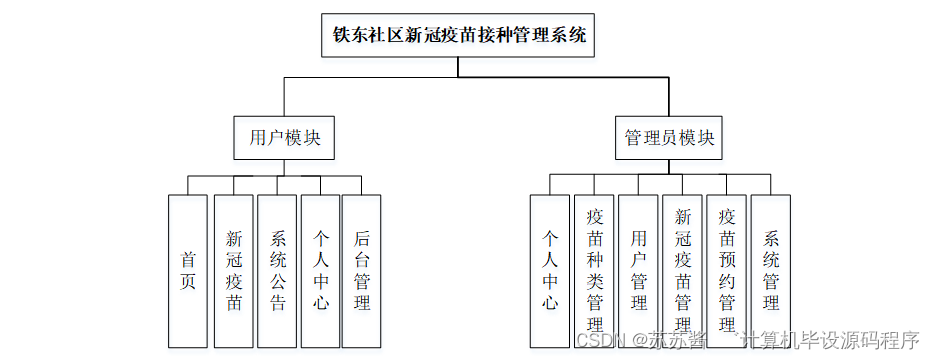 管理员功能:管理员登录系统后,能对个人中心、疫苗种类管理、用户管理、新冠疫苗管理、疫苗预约管理、系统管理等功能进行操作。管理员功能如下图所示: