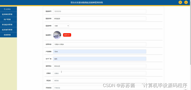 在新冠疫苗管理页面,点击新增,管理员通过输入疫苗编号、疫苗名称、疫苗种类、疫苗图片、适用年龄、产品规格、生产厂家、接种地址、过敏史、禁忌症、不良反应、可预防疾病、疫苗介绍等信息来新增新冠疫苗,如图5-7所示: