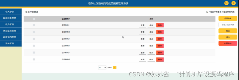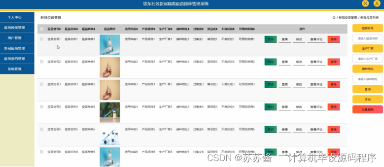 在新冠疫苗管理页面,管理员可以对疫苗编号、疫苗名称、疫苗种类、疫苗图片、适用年龄、产品规格、生产厂家、接种地址、过敏史、禁忌症、不良反应、可预防疾病等进行预约、查看、修改、查看评论、删除或添加等操作,如图5-6所示: