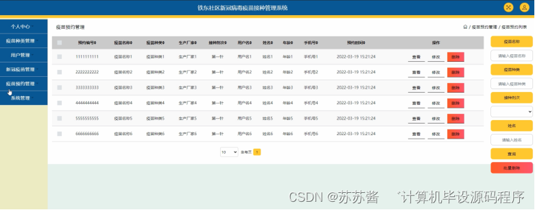 在疫苗预约管理页面,管理员可以对疫苗编号、疫苗名称、疫苗种类、生产厂家、接种剂次、用户名、姓名、年龄、手机号、预约时间等内容进行查看、修改、删除等操作,如图5-8所示: