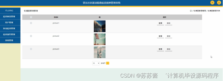 在系统管理页面,管理员可以对轮播图管理和系统公告进行相关操作。点击轮播图管理,可以对轮播图的值和名称进行查看或删除等操作,如图5-9所示: