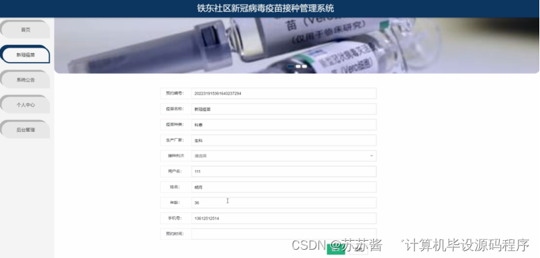 在新冠疫苗页面,点击预约,用户通过输入疫苗编号、疫苗名称、疫苗种类、生产厂家、接种剂次、用户名、姓名、年龄、手机号、预约时间等信息,点击提交进行疫苗预约,如图5-14所示。