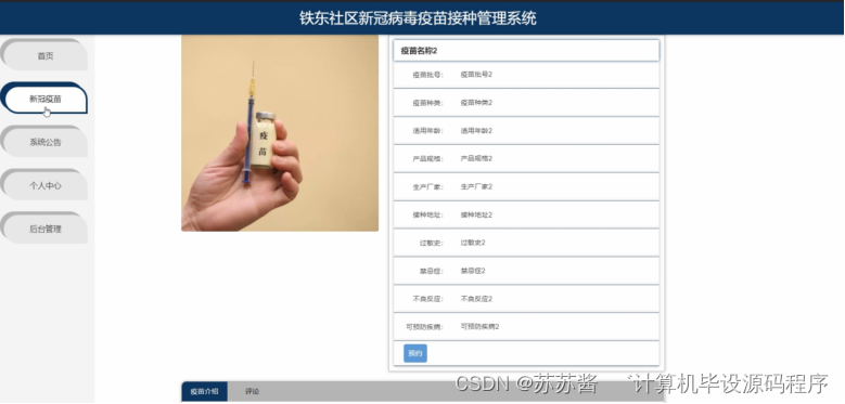 在新冠疫苗页面,用户可以查看疫苗编号、疫苗名称、疫苗种类、疫苗图片、适用年龄、产品规格、生产厂家、接种地址、过敏史、禁忌症、不良反应、可预防疾病、疫苗介绍等信息,并进行评论或预约等操作,如图5-13所示。