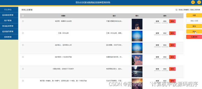 在系统公告管理页面,管理员可以标题、简介、图片等进行查看详情、修改、删除或添加等操作,如图5-10所示。