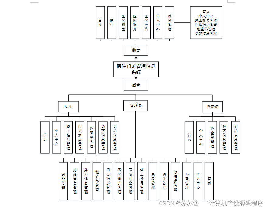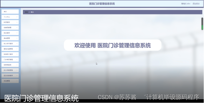 管理员登录进入医院门诊管理信息系统可以查看首页,个人中心,科室管理,收费员管理,医生管理,患者管理,线上挂号管理,医院科室管理,医院简介管理,门诊病历管理,检查单管理,药方信息管理,药品信息管理,系统管理等内容进行详细操作,如图5-8所示。