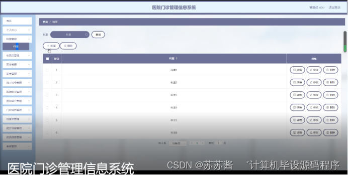 科室管理,在科室页面可以对索引,科室等内容进行详情,修改和删除等操作,如图5-9所示。