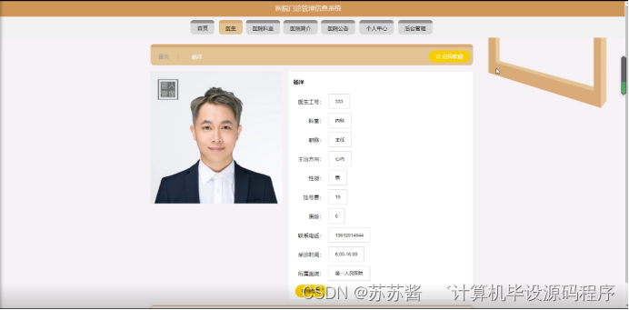 医生,在医生页面可以对医生工号,科室,职称,主治方向,性别,挂号费,医龄,联系电话,坐诊时间,所属医院等内容进行收藏或挂号等操作,如图5-4所示。