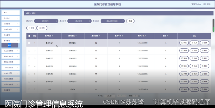 患者管理,在患者管理页面可以对索引,患者账号,患者姓名,患者性别,患者年龄,患者手机,血型等内容进行详情,修改和删除等操作,如图5-11所示。