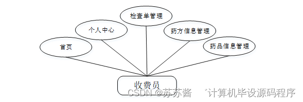 收费员登陆后,主要包括首页,个人中心,检查单管理,药方信息管理,药品信息管理等功能。收费员用例图如图3-2所示。