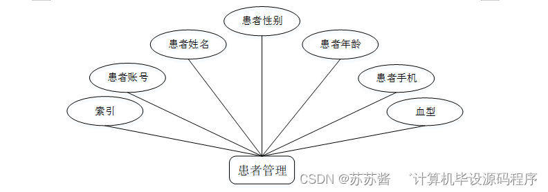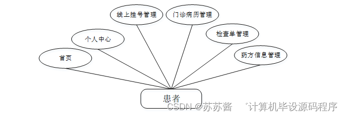 患者登陆后,主要模块包括首页,个人中心,线上挂号管理,门诊病历管理,检查单管理,药方信息管理,药品信息管理等功能。患者用例图如图3-2所示。