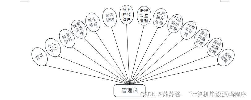 管理员登陆后,主要包括首页,个人中心,科室管理,收费员管理,医生管理,患者管理,线上挂号管理,医院科室管理,医院简介管理,门诊病历管理,检查单管理,药方信息管理,药品信息管理,系统管理等功能。管理员用例图如图3-1所示。