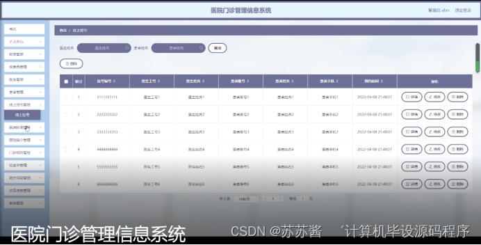 线上挂号管理,在线上挂号页面可以对索引,挂号编号,医生工号,医生姓名,患者账号,患者姓名,患者手机,预约时间等内容进行详情,修改和删除等操作,如图5-12所示。