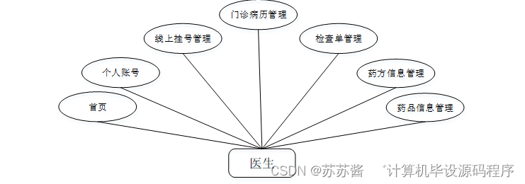 医生登陆后,主要包括首页,个人中心,线上挂号管理,门诊病历管理,检查单管理,药方信息管理,药品信息管理等功能。医生用例图如图3-2所示。