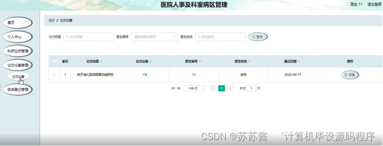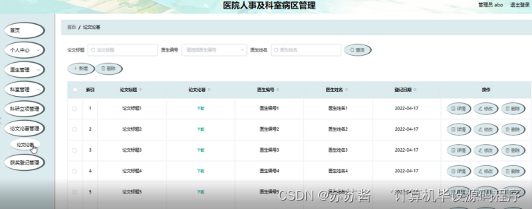 论文著管理;在论文著管理页面中可以查看论文标题、论文论著、医生编号、医生姓名、登记日期等内容,并进行详情、修改、删除等操作;如图5-6所示。