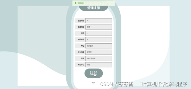 医生注册,在注册页面通过填写医生编号、医生姓名、密码、确认密码、专业、文化程度、电话、专业学位等信息进行注册,在登录页面通过填写账号、密码等信息进行登录,如图5-8所示。