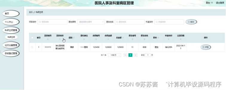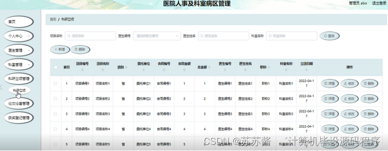 科研立项管理;在科研立项管理页面中可以查看项目编号、项目名称、级别、委托单位、合同编号、合同金额、总金额、医生编号、医生姓名、职称、科室名称、立项日期等内容,并进行详情、修改、删除等操作;如图5-5所示。