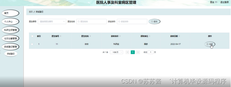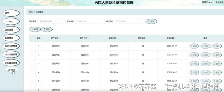 获奖登记管理;在获奖登记管理页面中可以查看医生编号、医生姓名、获奖名称、颁发单位、获奖日期等内容,并进行详情、修改、删除等操作;如图5-7所示。