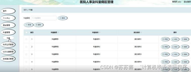 科室管理:在科室管理页面中可以查看科室编号、科室名称、英文名称等内容,并进行详情、修改或删除等操作,如图5-4所示。