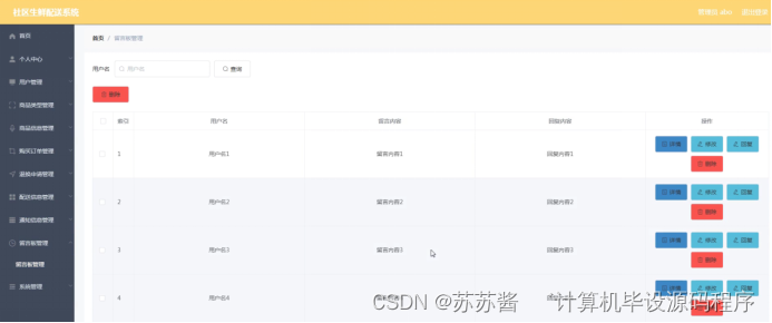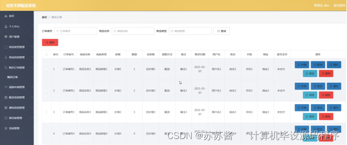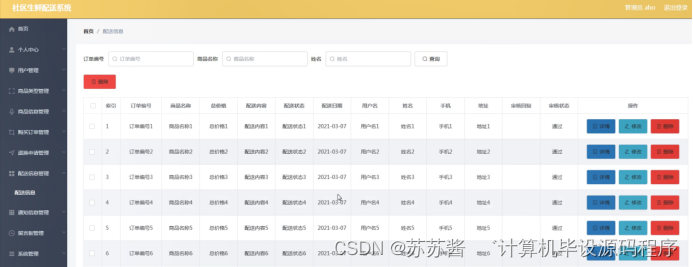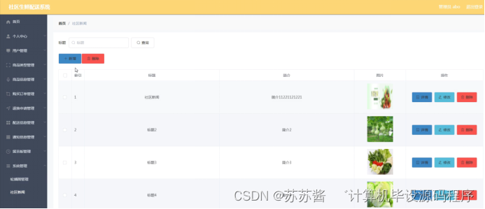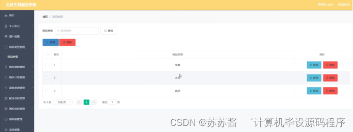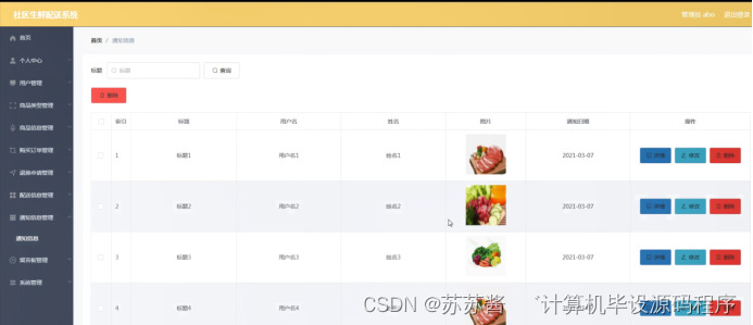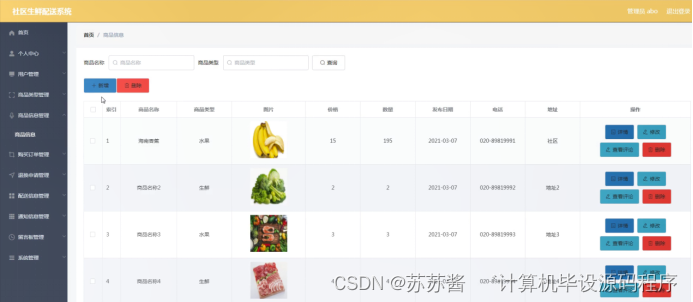 这是一个基于Java的社区生鲜配送系统,包括小程序端和管理员功能模块。用户可进行登录、注册、商品浏览与购买,管理员则能进行用户管理、商品信息维护等操作。系统采用Mybatis框架,提供了详细的界面展示和功能实现。