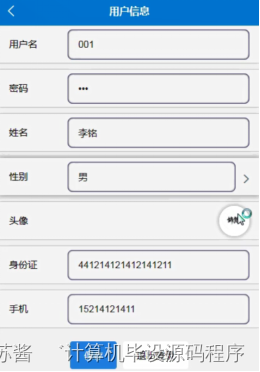 用户信息,在用户信息页面通过填写用户名、密码、姓名、性别、头像、身份证、手机等详细信息进行保存,如图5-6所示。