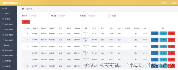 功能的完善性:可以管理首页、个人中心、用户管理、商品类型管理、商品信息管理、购买订单管理、退换申请管理、配送信息管理、通告信息管理、留言板管理、系统管理模块的修改维护操作。