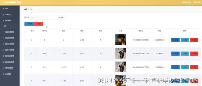 用户管理,在用户管理页面可以查看索引、用户名、密码、姓名、性别、头像、身份证、手机等内容,并可根据需要进行详情、修改或删除等操作,如图5-9所示。