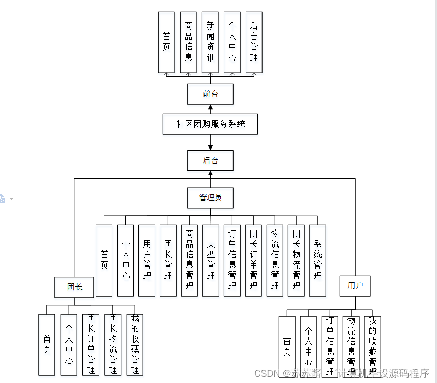 后台主要是管理员,主要功能包括首页、个人中心、用户管理、团长管理、商品信息管理、类型管理、订单信息管理、团长订单管理、物流信息管理、团长物流管理、系统管理等;