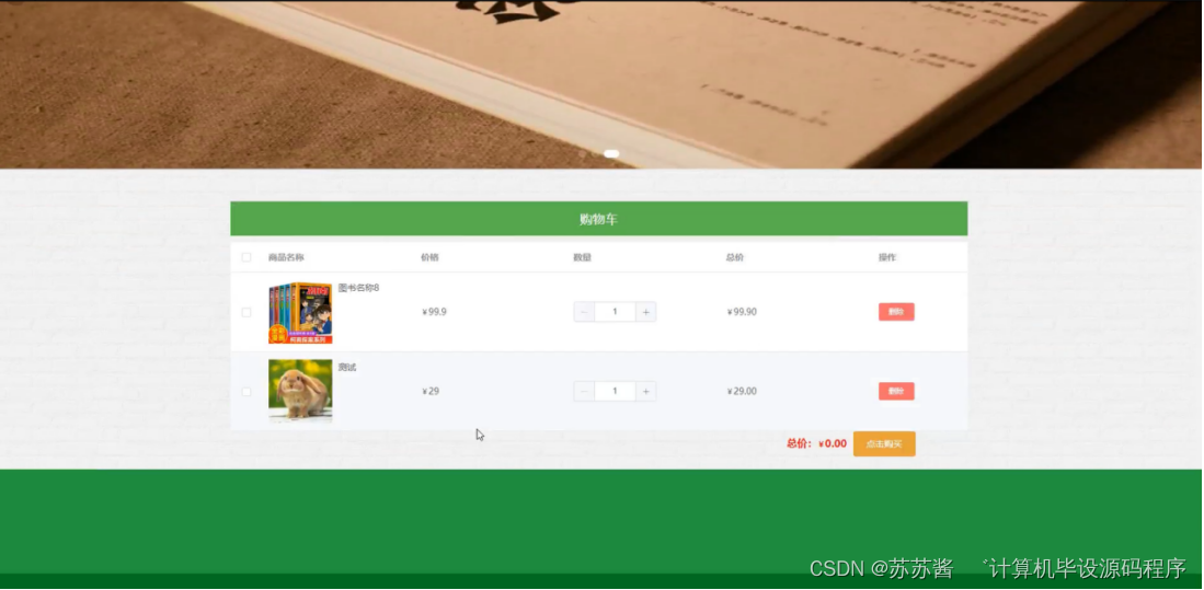 用户点击购物车,进入购物车界面,用户可查看购物车内图书的数量、价格,并可进行删除或点击购买的操作,界面如图5-7所示: