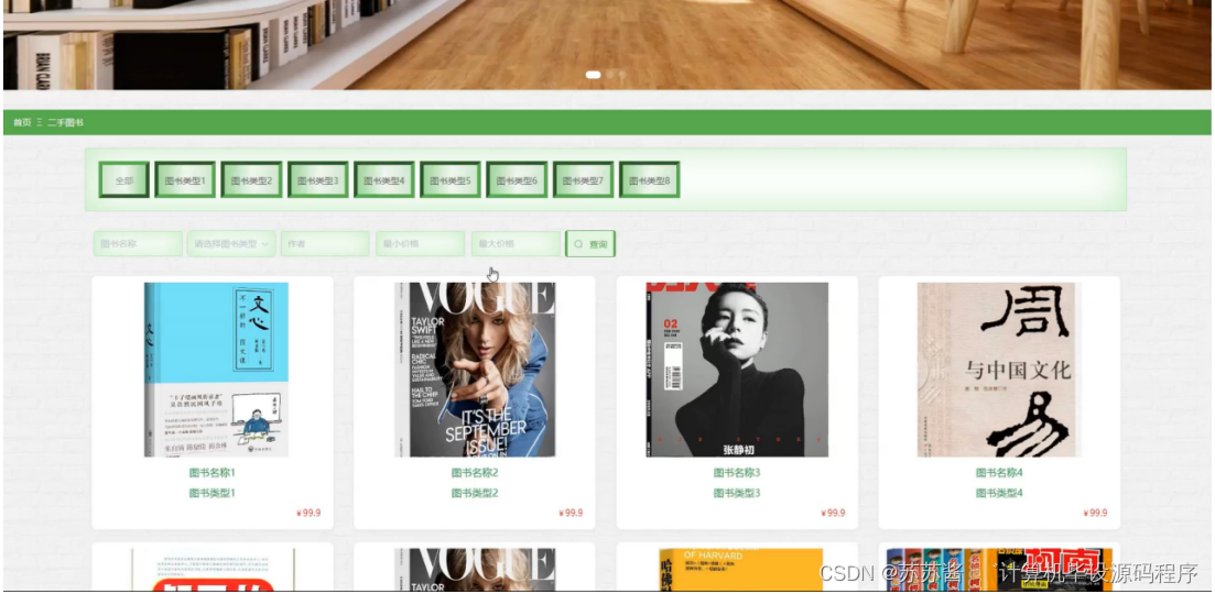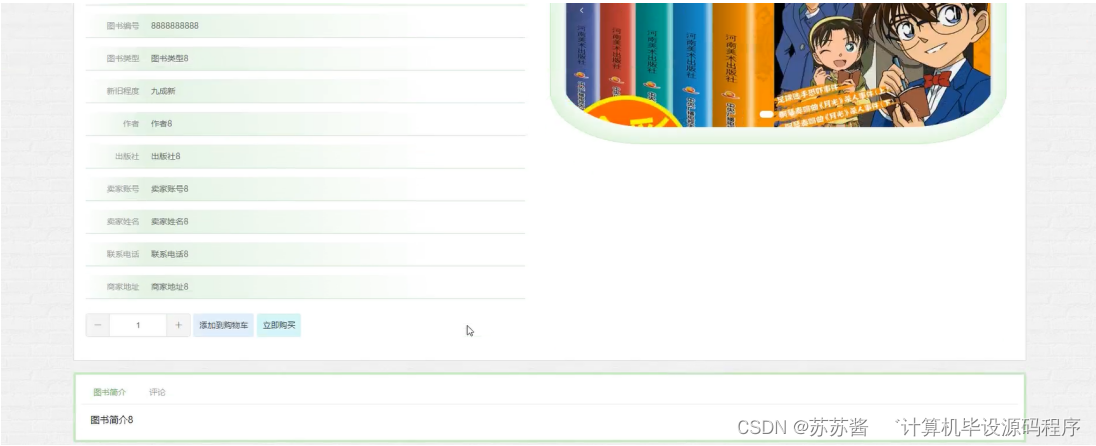 用户点击二手图书,进入二手图书界面,用户可输入图书名称、选择图书类型、作者、价格区间进行查询图书的操作,并可点击图书进去查看详情、查看评论、选择数量、添加到购物车、立即购买等操作,界面如图5-4所示: