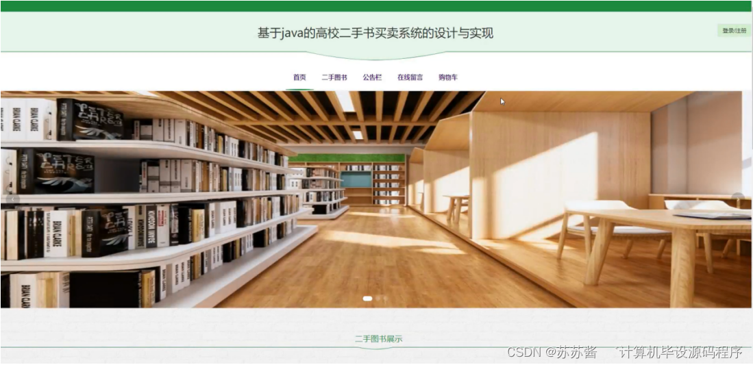 用户登录后,用户能够看到基于java的高校二手书买卖系统的导航条包含首页、二手书、公告栏、在线留言、购物车、个人中心等,界面如图5-3所示: