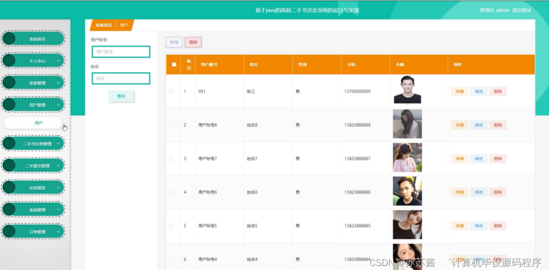 管理员点击用户管理,进入用户管理页面,管理员可通过输入用户账号、姓名进行查询、新增、删除的操作,并可对用户信息等进行查看详情、修改、删除等操作。如图5-13所示: