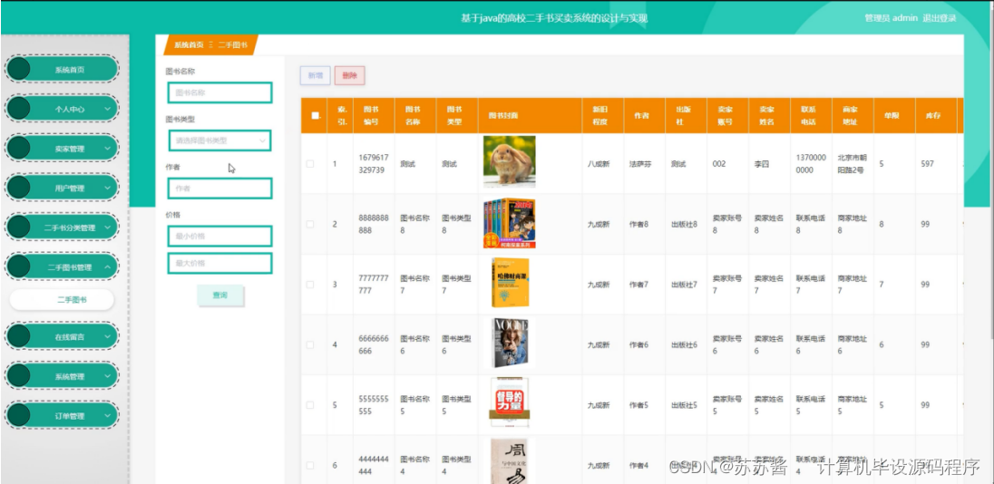 管理员点击二手图书管理,进入二手图书管理页面,管理员可通过输入图书名称、图书类型、作者、价格区间进行查询、新增、删除的操作,并可对二手图书信息进行查看详情、删除等操作。如图5-15所示: